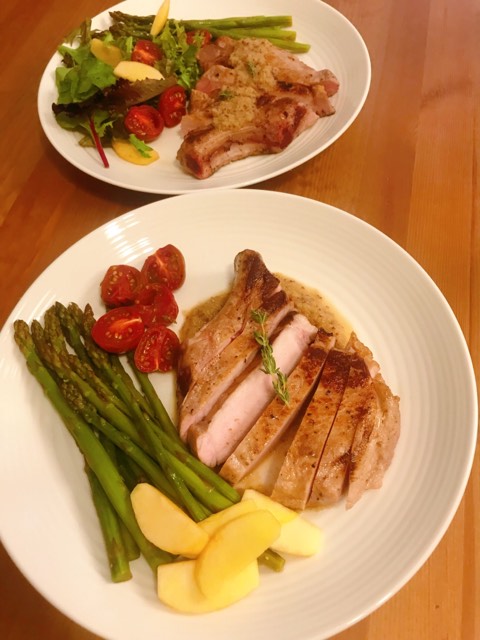 (5)將豬扒倒出,將汁和蘋果留起做醬汁,百里香和蒜頭放在鑊中加入一些油一起煮至金黃夾出來(可使油留有香草的味道),用廚房紙印乾豬扒水份,放入鑊中用火煎至金黃即可上碟。