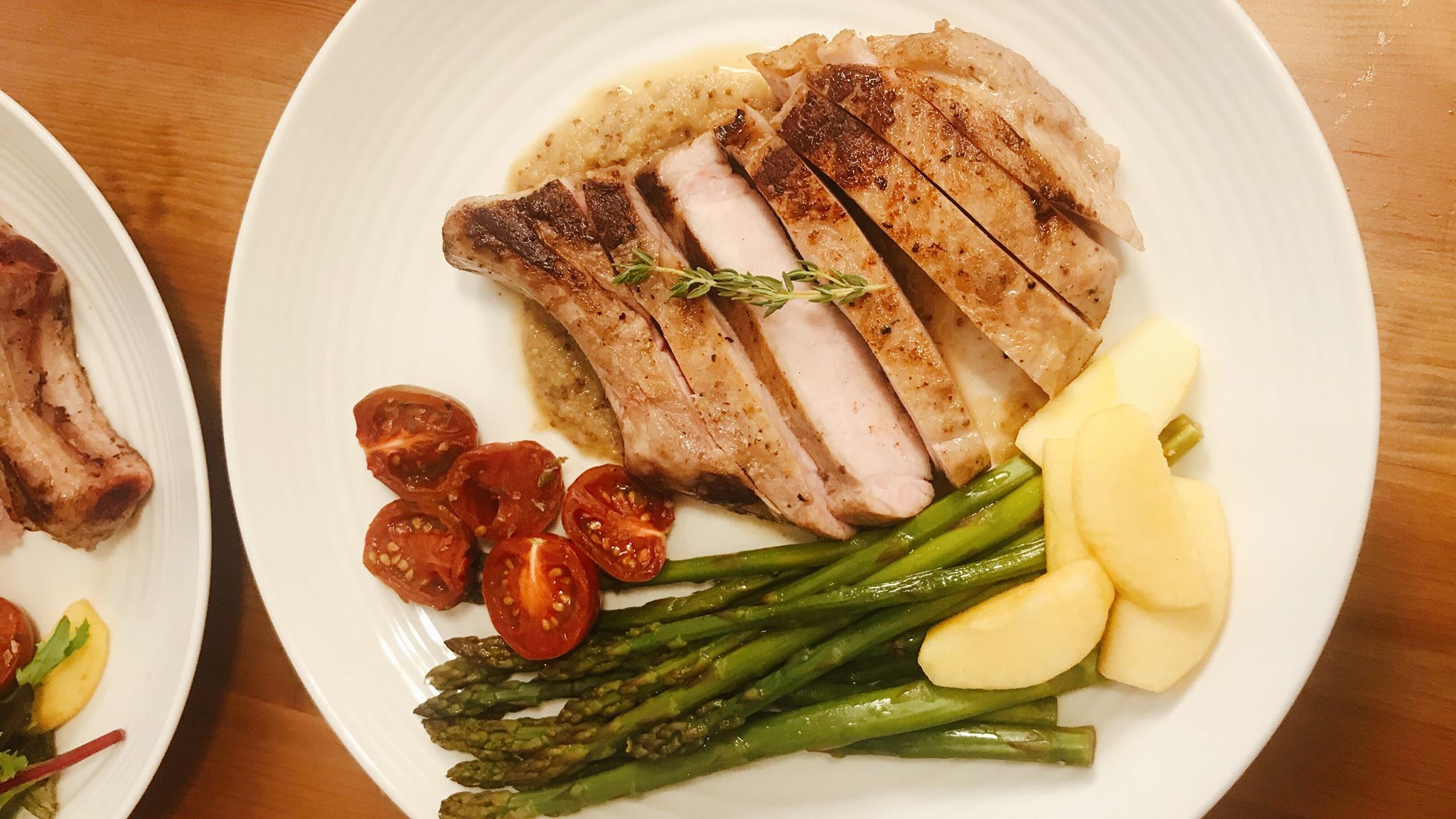 (6)將煮豬扒的汁和蘋果倒入小鍋中,用手動攪拌器打滑身,以小火煮至熱,加入芥末醬和蜜糖,自行試味和調整即可淋在豬扒上(配各式沙律或配菜)供食。