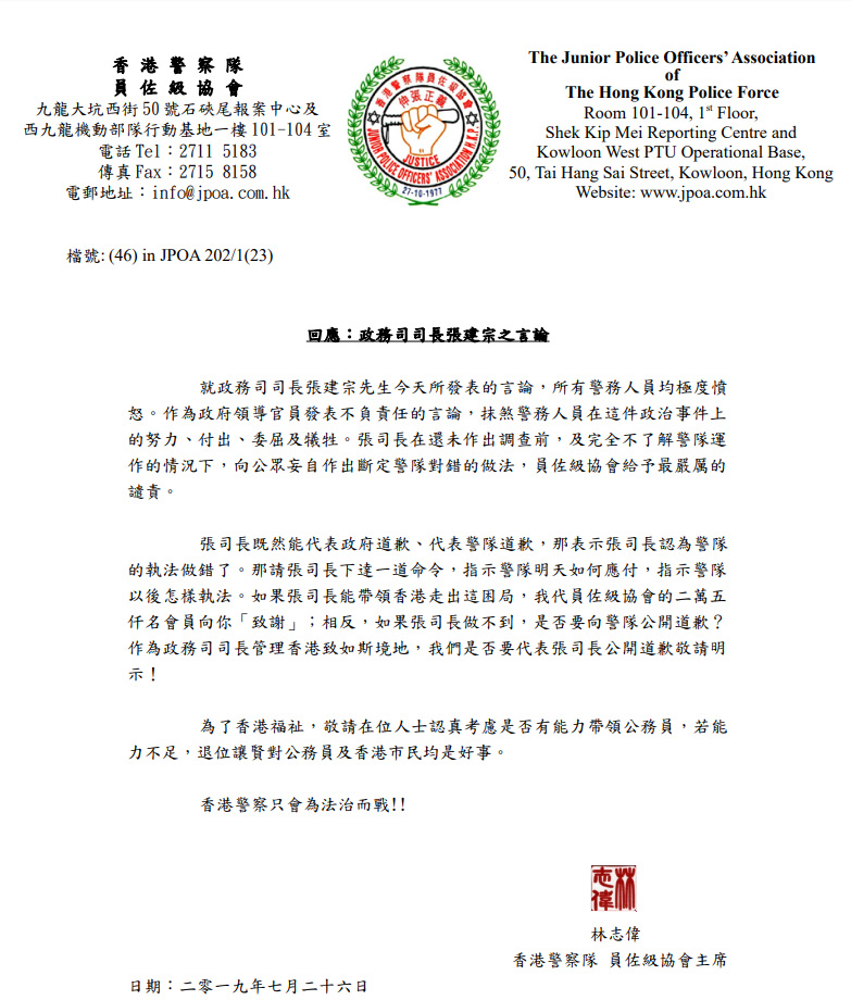 政務司司長張建宗昨日(7月26日)就元朗事件見記者,提到警方處理方面都承認與市民期望有落差,更指「我絕對願意就處理手法向市民道歉」,此番言論進一步引來警察反彈。香港警察隊員佐級協會主席林志偉形容,張建宗的言論「所有警務人員均極度憤怒」,強調香港警察只會為法治而戰。
