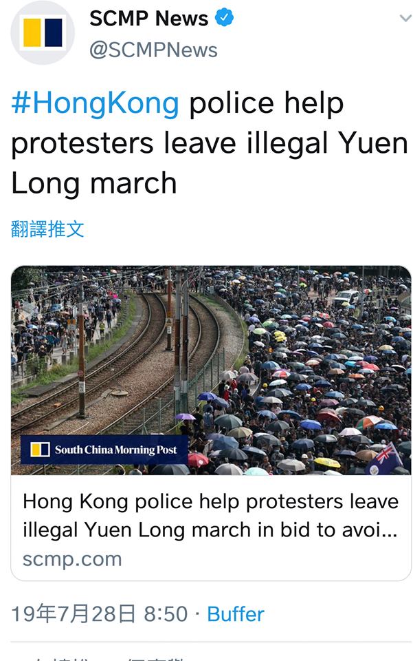 然而,英文媒體《南華早報》今日(7月28日)報道「光復元朗」行動時,標題竟然是「Hong Kong police help protesters leave illegal Yuen Long march in bid to avoid bloody battle in town rocked by mob violence」,有不少讀者在SCMP的社交媒體留言,不滿有關警察協助示威者離開(police help protesters leave)的說法。
