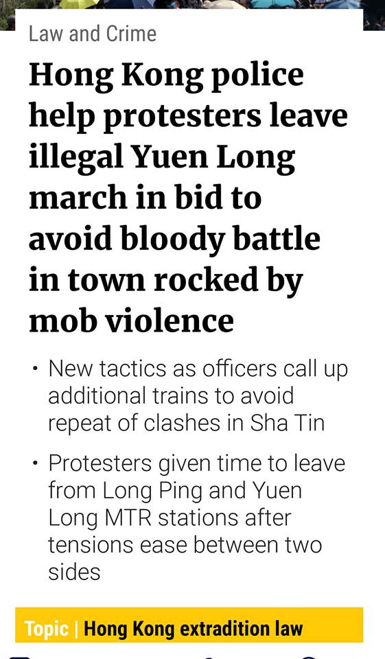 中午過後,該篇新聞的標題略為改動,改為「Hong Kong police adopt new tactics to make protesters leave illegal Yuen Long march in bid to avoid bloody battle in town rocked by mob violence」,然而,該新聞的連結起初由原標題生成,故現時的報道連結仍然見到「hong-kong-police-help-protesters-leave-illegal-yuen」。