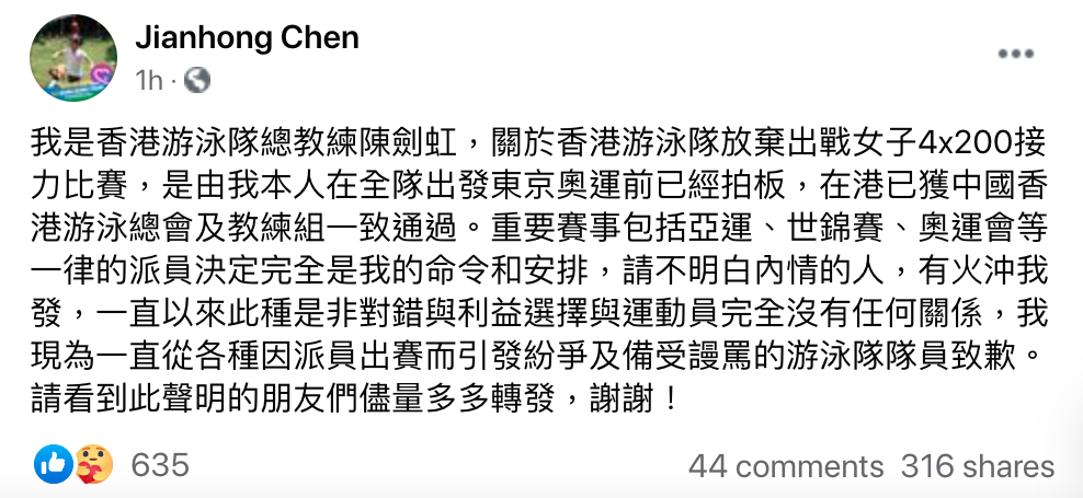 一個於體壇經常出現的戰略,竟然被網民無端攻擊,今日(7月29日)泳隊總教練陳劍虹於社交平台以個人帳戶發文回應。