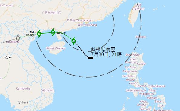 在晚上9時,位於南海北部的熱帶低氣壓集結在香港以南約500公里,即在北緯17.8度,東經114.4度附近,預料向西北移動,時速約12公里,移向廣東西部一帶。
