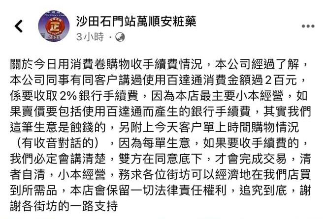 涉事的「沙田石門站萬順安粧藥」於社交網頁回應,指職員有向客人表示,使用八達通消費金額超過200元,要收取2%銀行手續費,因藥房是小本經營,如果賣價要包括使用八達通而產生的銀行手續費,藥房該筆生意要蝕錢。