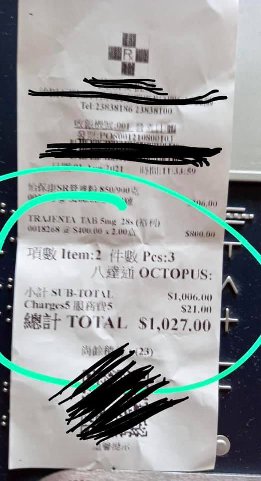 首期2000元電子消費券已經可以使用,網上流傳沙田一間藥房發出的單據,消費金額為1006元,顧客用八達通支付,被藥房就收取21元服務費。