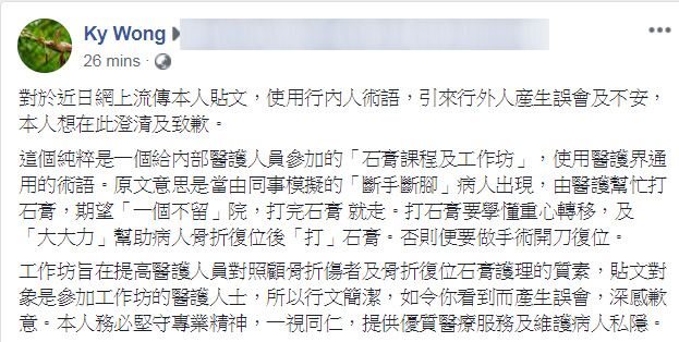 聲明指,工作坊旨在提高醫護人員對照顧骨折傷者及骨折復位石膏護理的質素,貼文對象是參加工作坊的醫護人士,所以行文簡潔,如令人產生誤會,深感歉意。