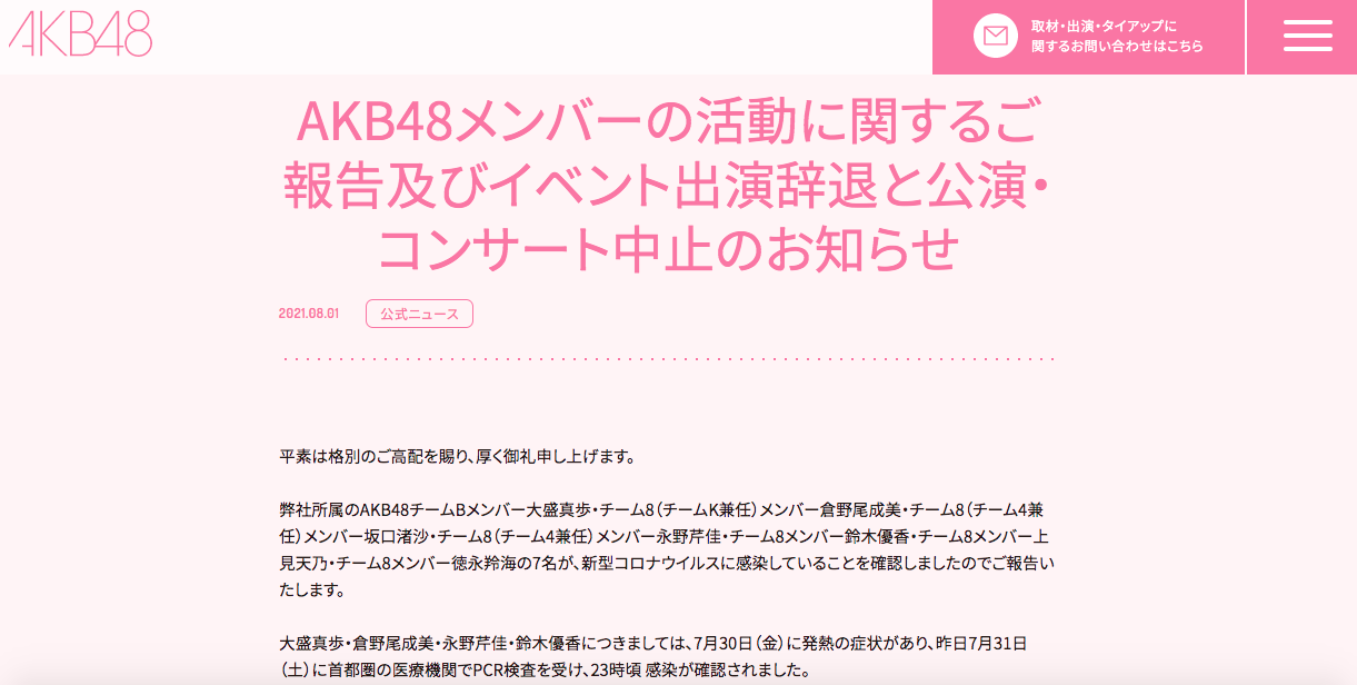 女團AKB48有七名成員確診,包括大盛真步、倉野尾成美、坂口渚沙、永野芹佳、鈴木優香、上見天乃和德永羚海,其中多人有發燒等病徵。有關方面宣布,取消AKB48由今日起至8月8日所有演出和活動。
