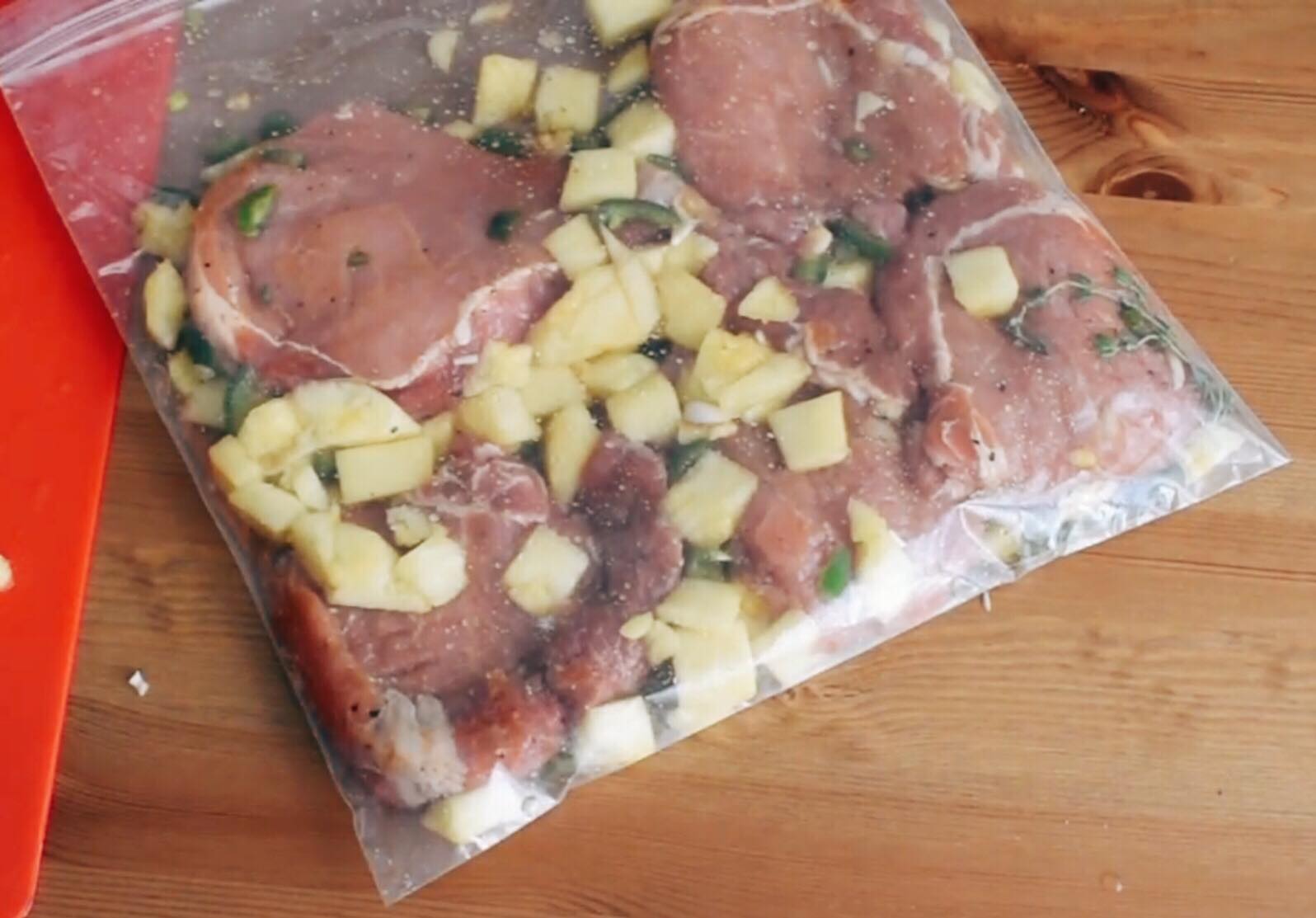(4)將(3)的豬扒,加入菠蘿、Jalapeno辣椒和百里香放入真空或密實袋,用真空機將袋抽真空或用一盤水將袋逼出空氣,將袋收口。