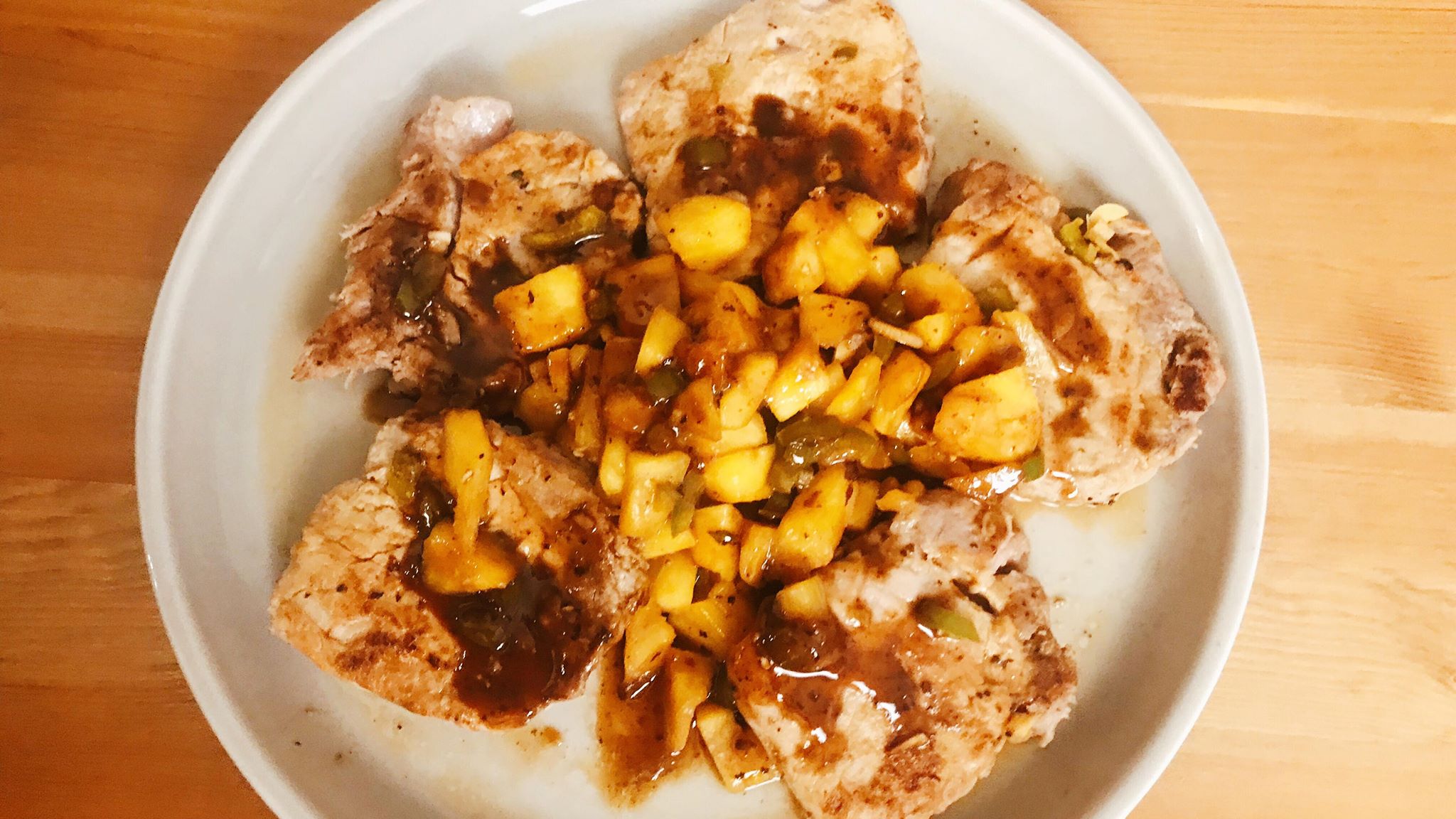 (7)將真空袋中的汁放在煎完豬扒的鑊加熱,煮至滾後載起菠蘿、Jalapeno辣椒上碟,轉小火煮至收汁一半成為止,加入蜜糖,拌勻,自行試味和調整即可淋在豬扒上供食。