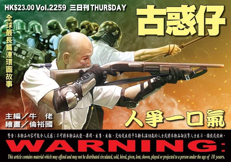 明日出版的《古惑仔》題目為「人爭一口氣」,封面見到又男子手持長槍,令人想起7月30日市民包圍葵涌警署外時爆發衝突,有光頭警員於巴士總站舉長槍示警的一幕。