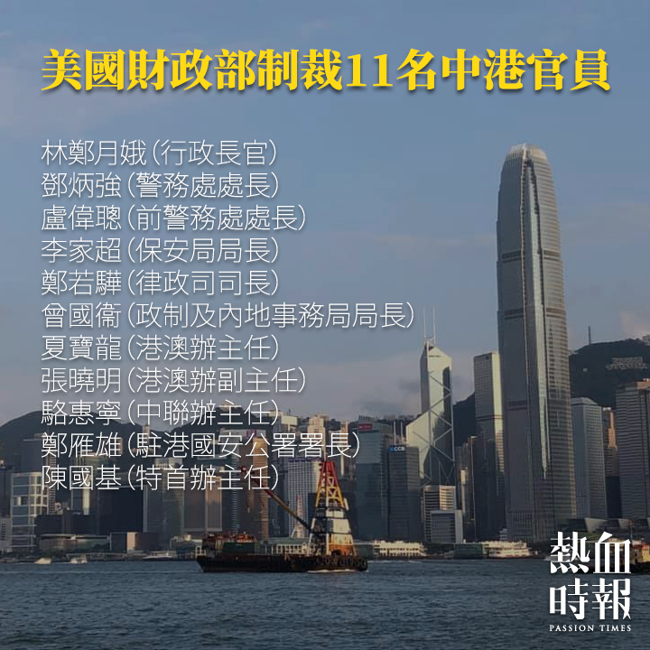 美國財政部周五(8月7日)宣布,制裁包括特首林鄭在內的11名中港官員,指他們破壞香港的自治,並限制港人言論及集會自由。
