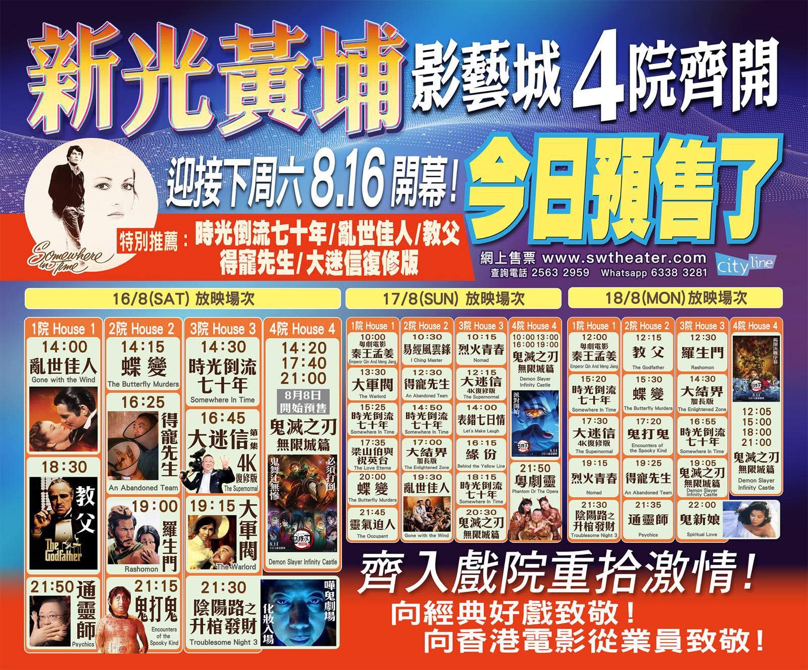 首頁文化藝術電影 新光黃埔影藝城8.16開幕 20多套經典戲碼門票即日預售 作者:熱血編輯部 (陳五) 08-07-2025 Like Facebook Twitter 更多 Like 分享0 留言0 新光戲院早前接手嘉禾黃埔之後,新成立的「新光黃埔影藝城」將於下周六(8月16日)開幕。屆時將會4院齊開,並有20多套經典戲碼列陣,而8月16至18日門票今日(8月7日)網上預售。主事人李居明的特別推薦影片包括:《時光倒流七十年》、《亂世佳人》、《教父》、《得寵先生》及《大迷信修復版》。至於《「鬼滅之刃」無限城篇》,則於8月8日起預售。