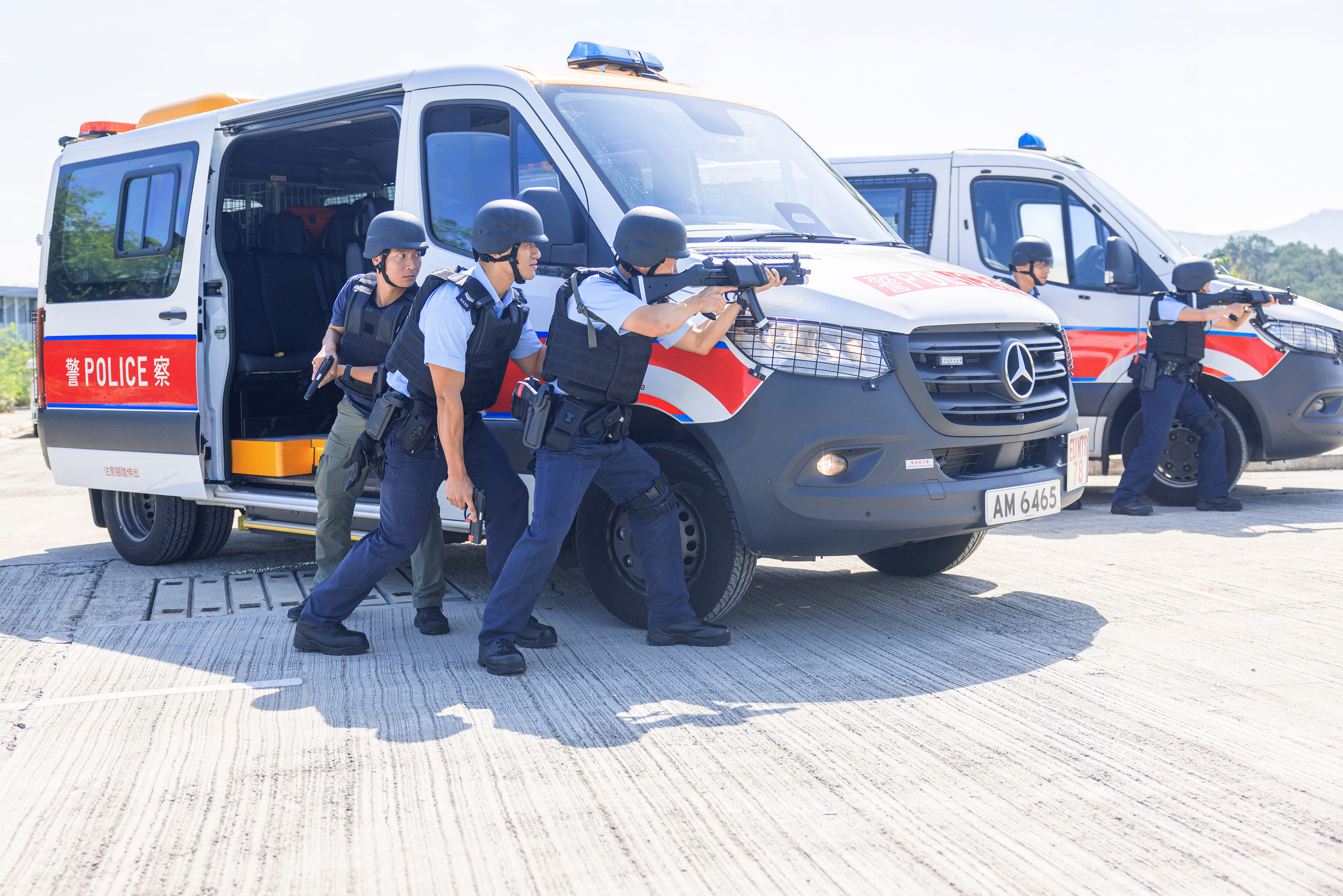 警務處新界南總區衝鋒隊今日(8月8日)在大嶼山幻想道竹篙灣社區隔離設施舉行代號為「飛鷹」、「緗堡」及「雨箭」的跨部門反恐及重大事故演習,以加強相關政府部門及持份者在第十五屆全國運動會舉行期間,處理突發事故時的溝通、協調及應變能力。