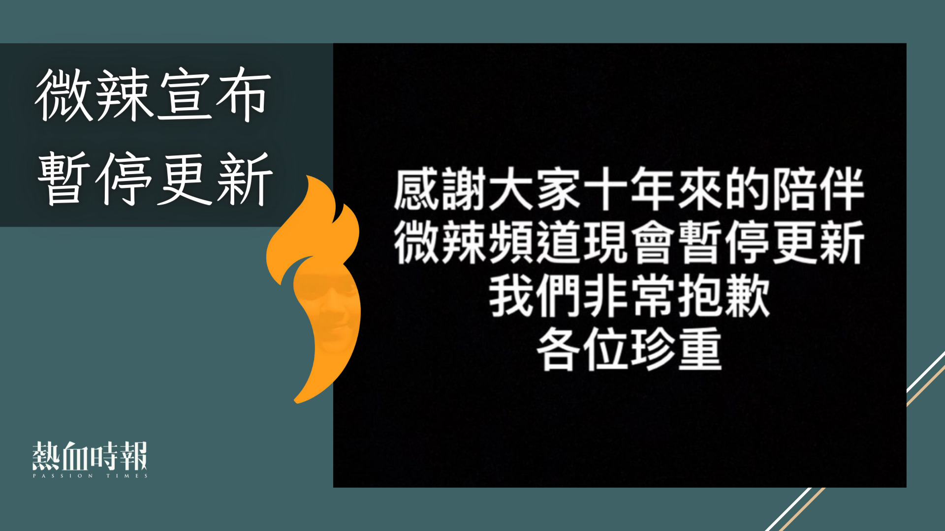 澳門娛樂頻道微辣風波有新進展,官方的Instagram今晚(8月10日)發出簡短聲明,指「感謝大家十年來的陪伴,微辣頻道現會暫停更新,我們非常抱歉,各位珍重」。