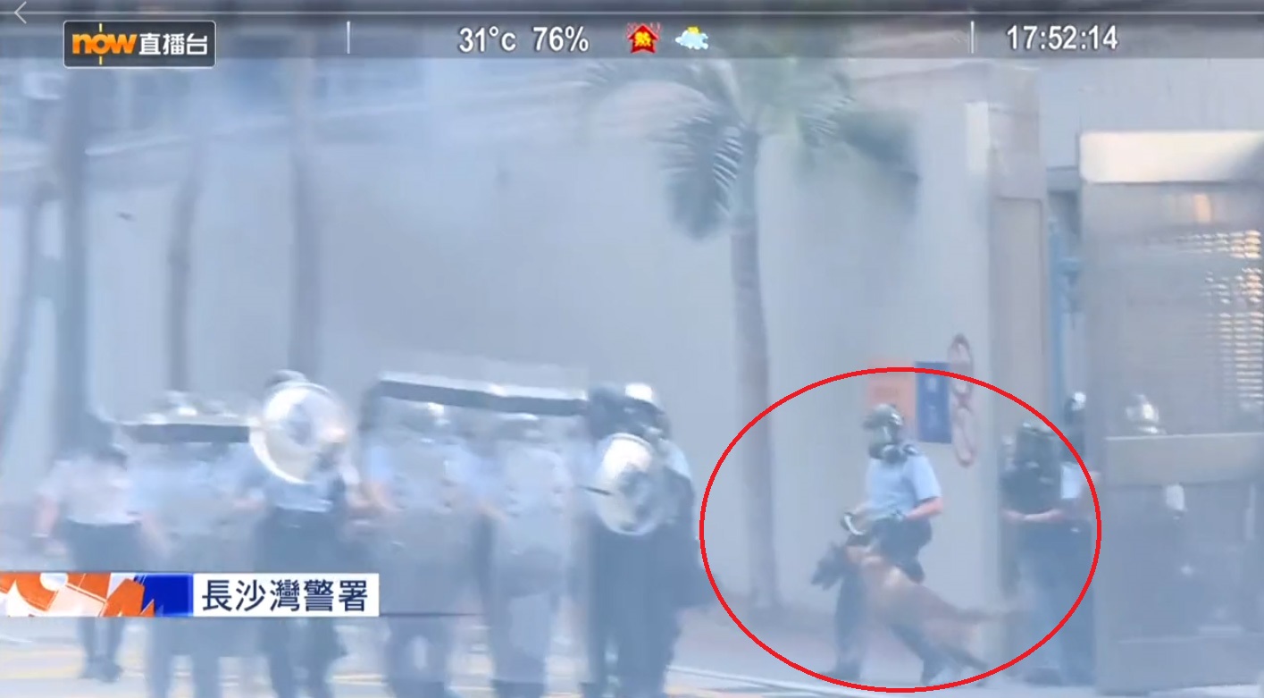 今日(8月11日)下午5時許,警方於長沙灣警署附近施放催淚彈,期間現場竟然有戴上頭盔及面具的警員,拖著一隻警犬行出閘外。