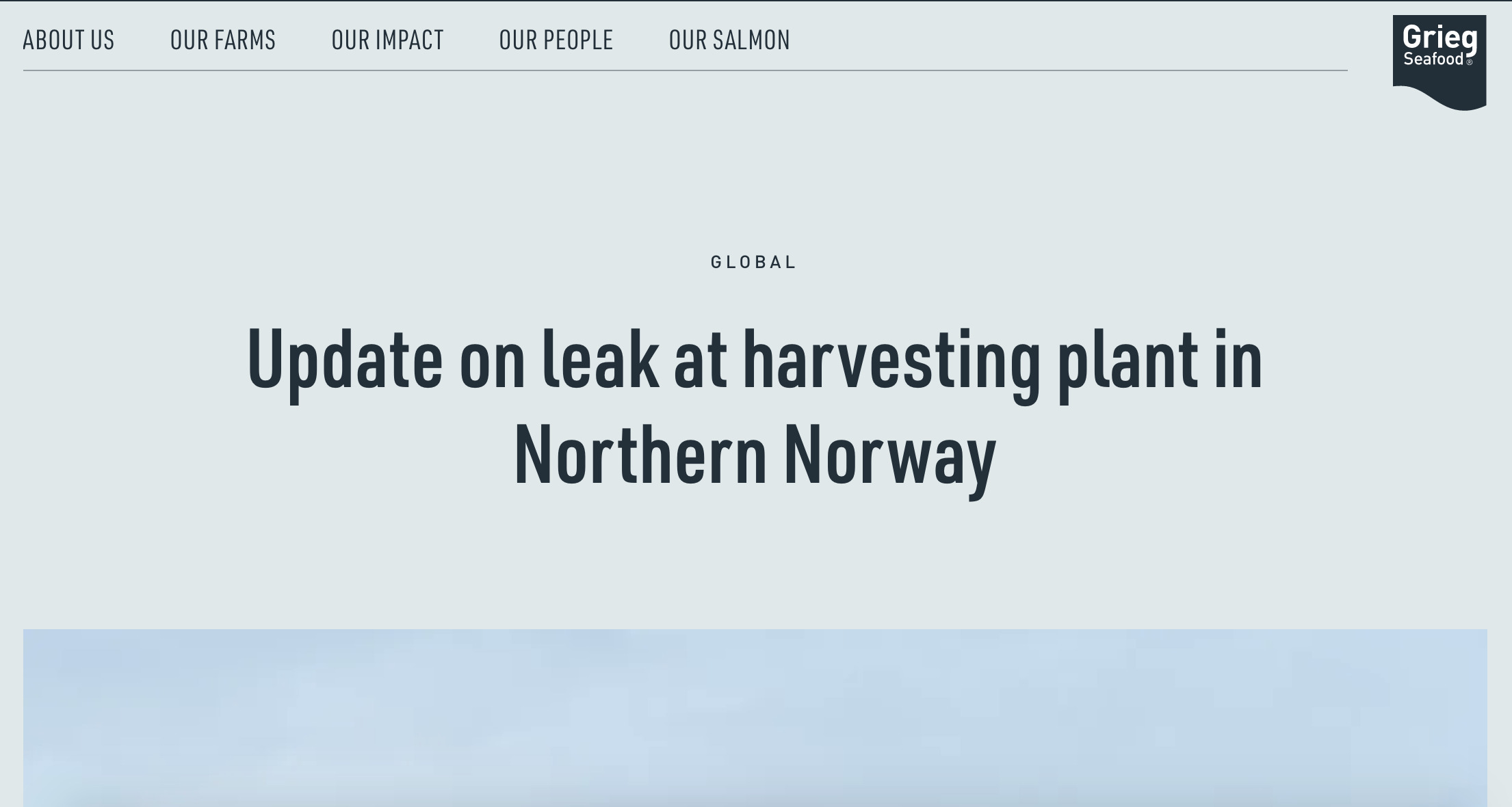 挪威三文魚供應商格里格海產(Grieg Seafood Finnmark)表示,公司位於挪威北部阿爾塔(Alta)的廠房,意外洩漏近四千加侖氯氣,導致其養殖場有近十萬條三文魚死亡,約值美金340萬。