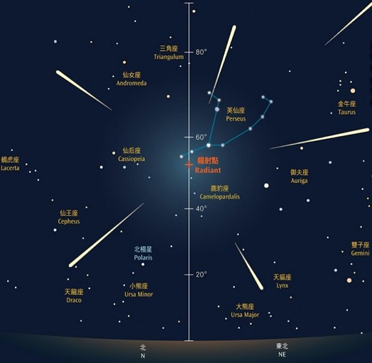 流星雨發生時,流星像是從星空中某一點(稱為輻射點)向外散射而出。英仙座流星雨的輻射點會在今晚約10時從東北方升起,隨着輻射點慢慢升高,流星的數量亦隨之增加。