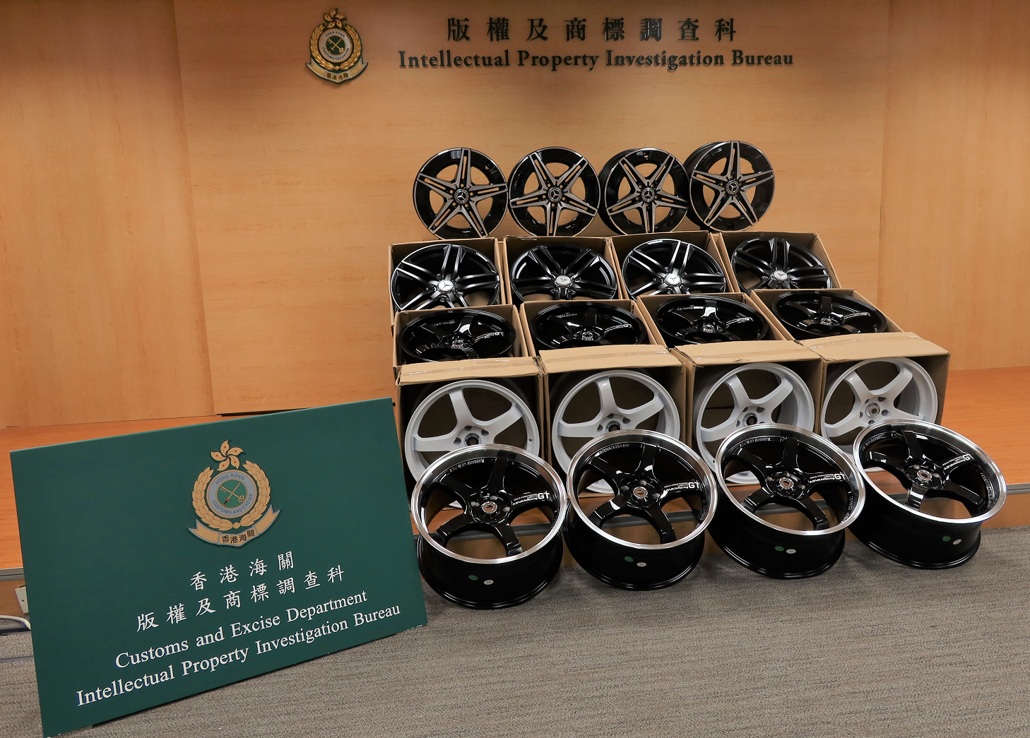 香港海關昨日(8月11日)採取執法行動打擊售賣冒牌汽車輪圈,在一間汽車零件店舖檢獲42個懷疑冒牌汽車輪圈,估計市值約5萬元。