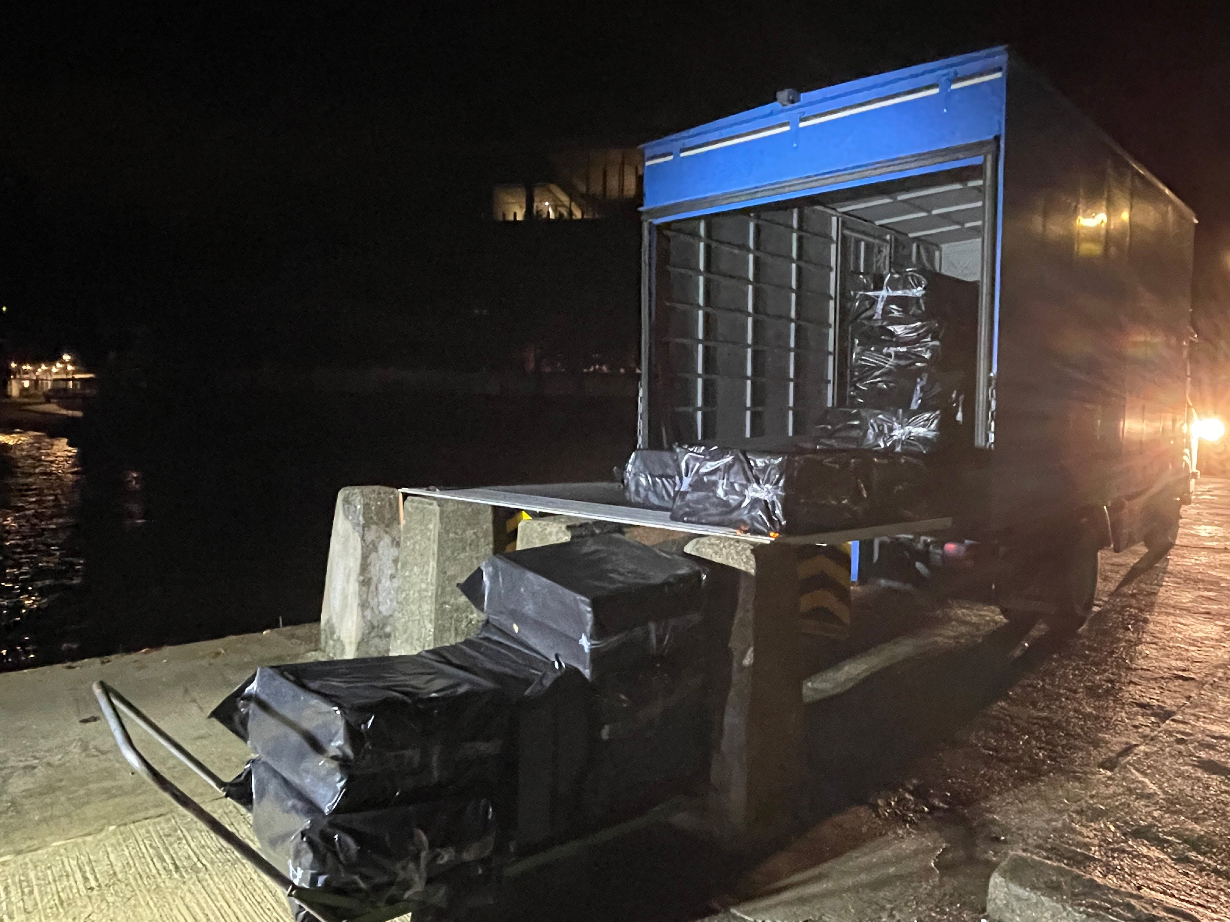 海關今日凌晨在赤柱聖士提反灣(南)碼頭進行反私煙行動,發現有數名可疑男子從船上將大量紙箱搬運到岸邊一輛可疑貨車,懷疑正進行走私活動,遂採取行動。海關人員上前截查時,數名懷疑涉案男子立即跳海逃走,海關人員最終截獲及拘捕5名逃走男子,年齡介乎17歲至56歲。經檢查後,海關人員在貨車上及碼頭附近位置檢獲該批懷疑私煙,並扣查該懷疑涉案貨車。