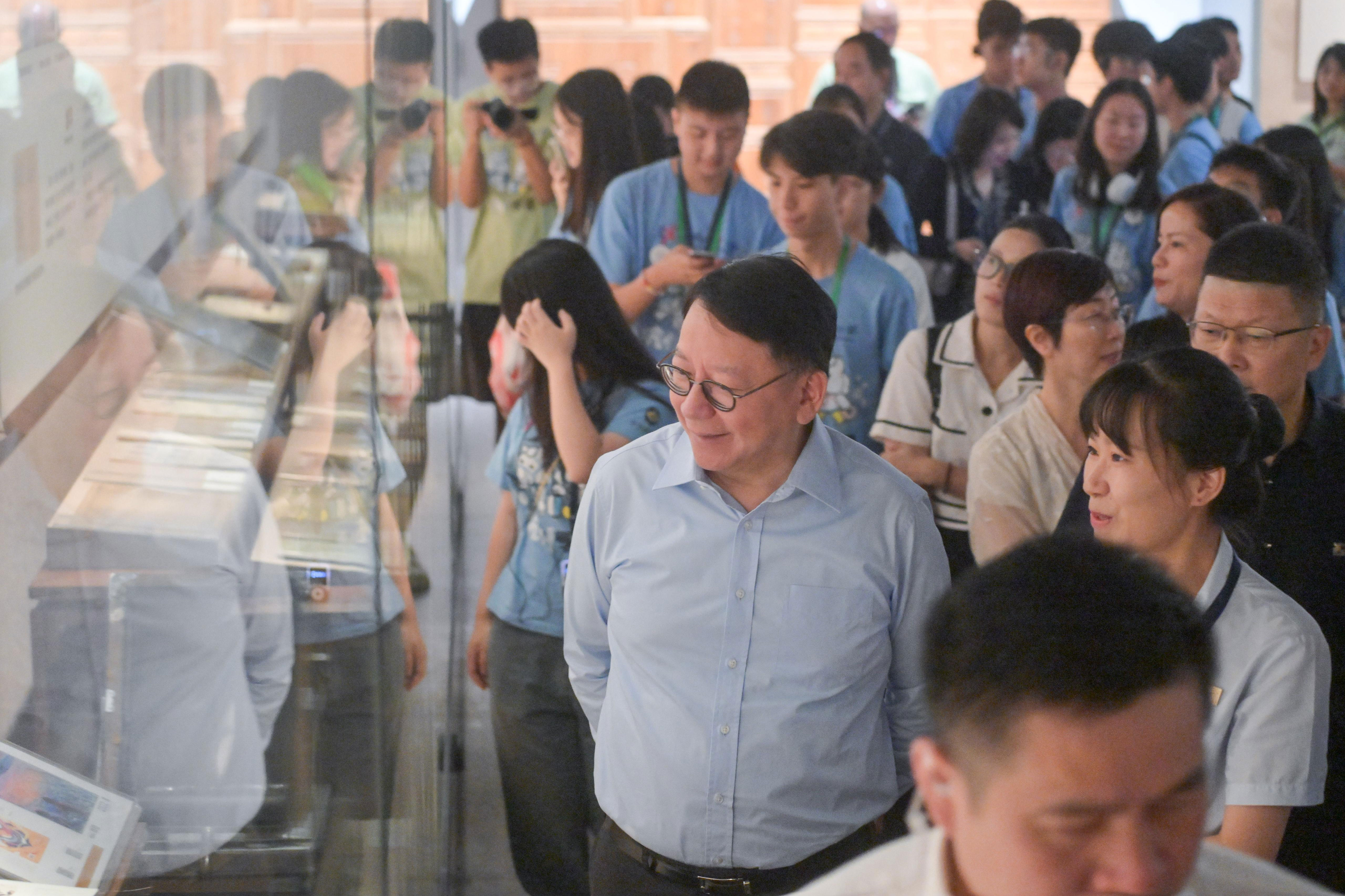早上,陳國基到訪杭州國家版本館,參觀其展示的中華典籍版本和中華文物,以及其融合自然環境的布局。他亦在館內與「共創明『Teen』計劃」杭州學習團的學員及友師交流,了解學員如何善用計劃的財政支援,提升學習能力和培養個人興趣,亦欣悉他們通過是次參觀體驗,加深了解祖國歷史文化,加強國民身分認同。他勉勵學員繼續把握「共創明『Teen』計劃」下豐富多元的學習機會,不斷增值自我。