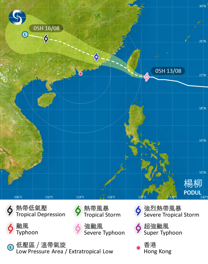天文台預料「楊柳」今日會橫過台灣南部,在今日大部分時間與本港保持超過400公里距離,一號戒備信號會在今日日間維持。