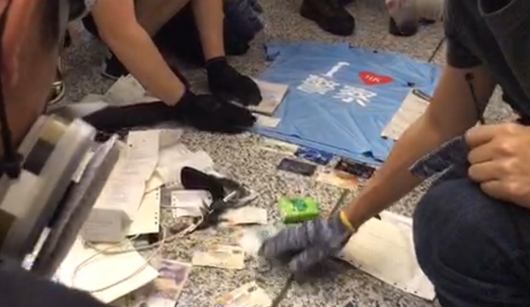 示威者搶到他的袋後,發現他藏有「I❤警察」的淺藍色T-Shirt,與早前荃灣社團人士所穿為同一款式,該男子並持有中國護照。
