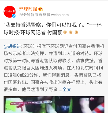 胡錫進表示,付國豪今次赴港除了報道,沒有任何其他任務,又讚揚他是一名善良、正直的記者,認為這種善良和正直支持了他面對暴徒時的英勇。