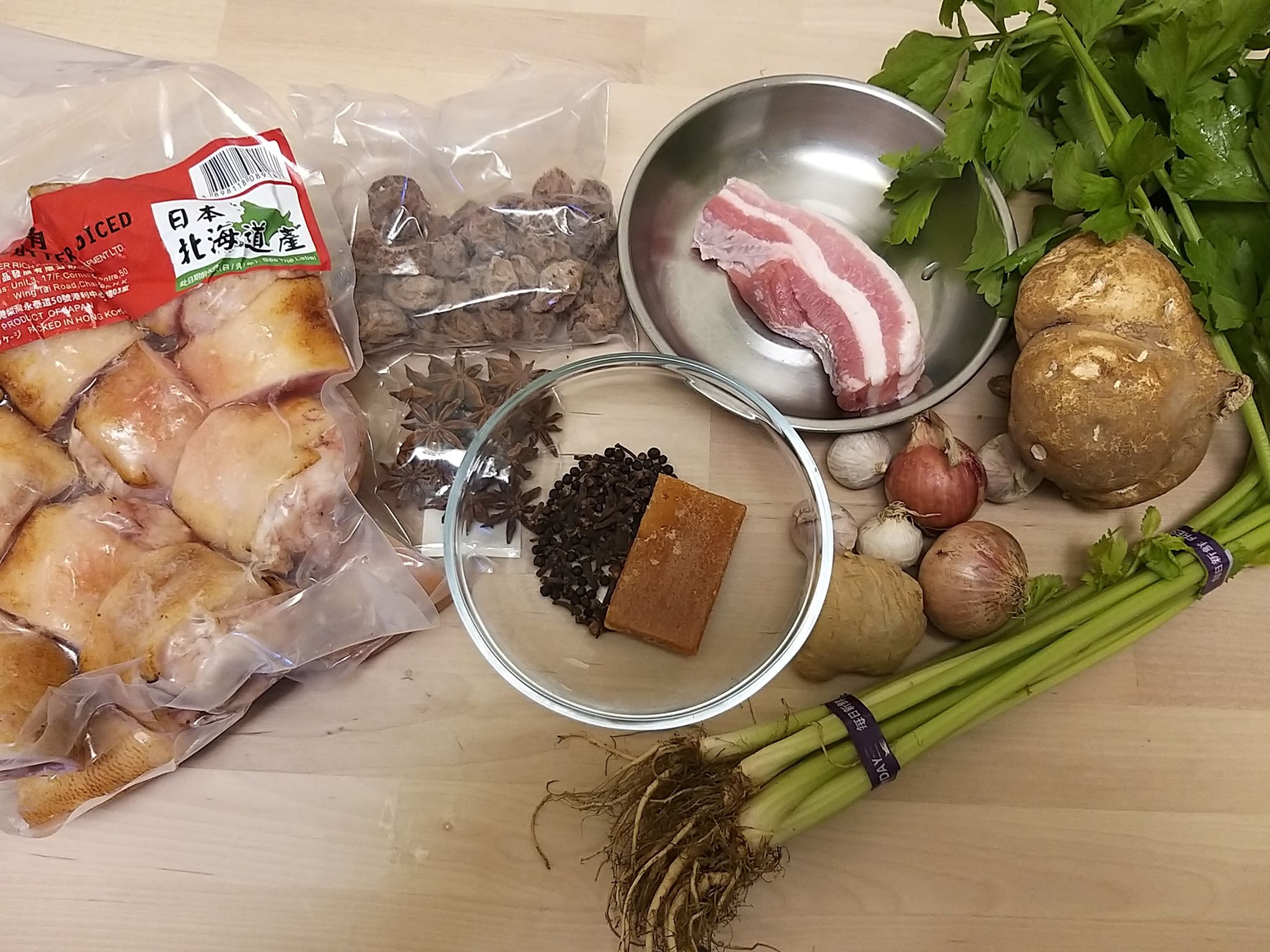 材料:豬腳、話梅、乾蔥頭、蒜、薑、八角、丁香、黑胡椒粒