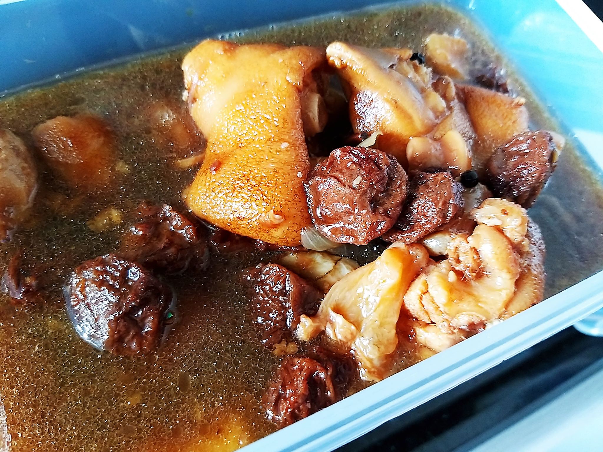 調味:紹興酒、鎮江香醋4湯匙、老抽1湯匙、生抽4湯匙、雞湯4碗、片糖適量、水