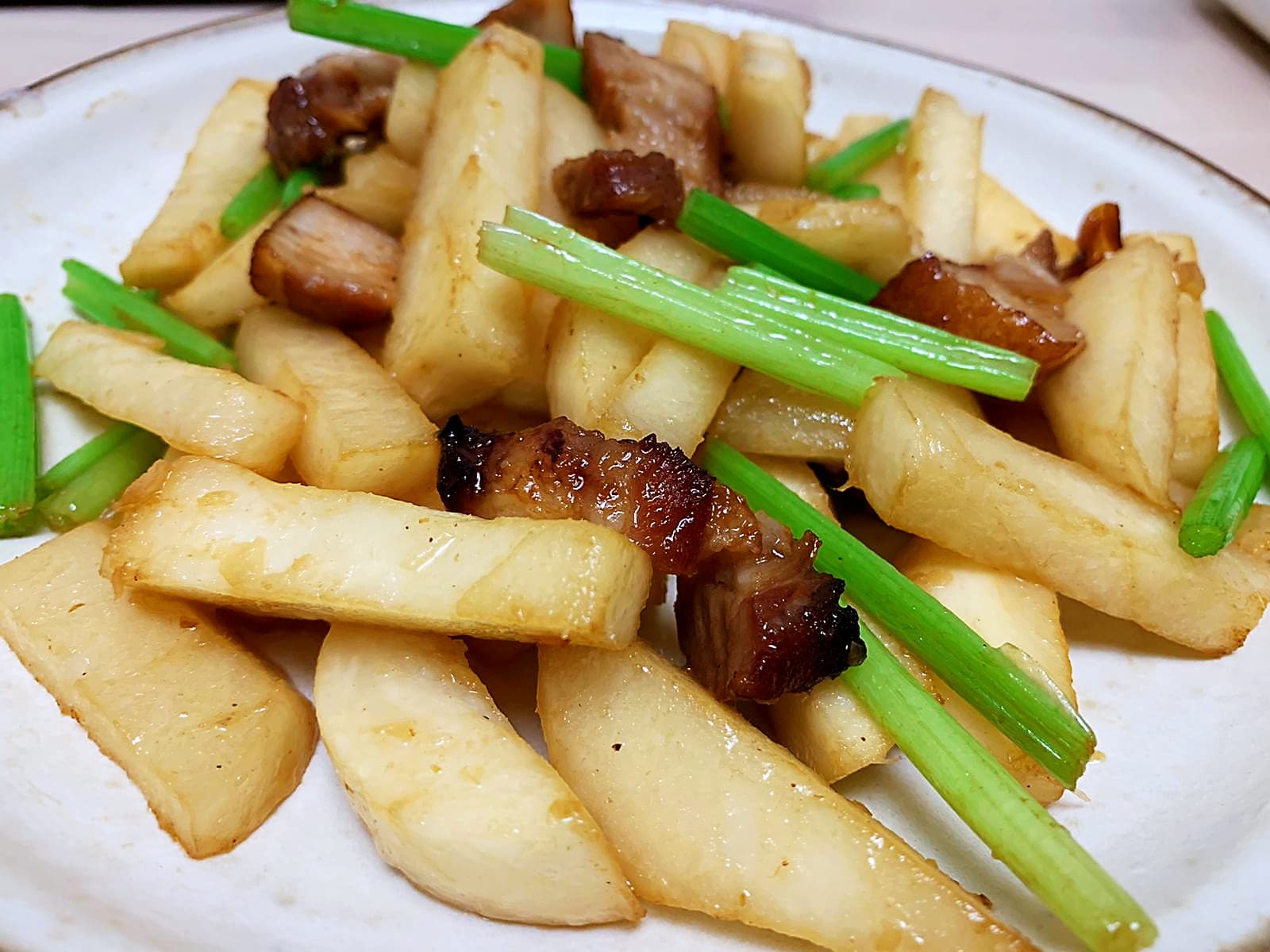 .加入沙葛翻炒,加入適量雞粉和2湯匙水。