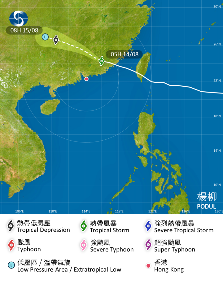 一號戒備信號仍然生效,天文台表示,「楊柳」在未來數小時最接近珠江口一帶,在香港東北面300公里內掠過。除非「楊柳」採取較為偏南的路徑靠近珠江口,否則改發更高熱帶氣旋警告信號的機會為低。