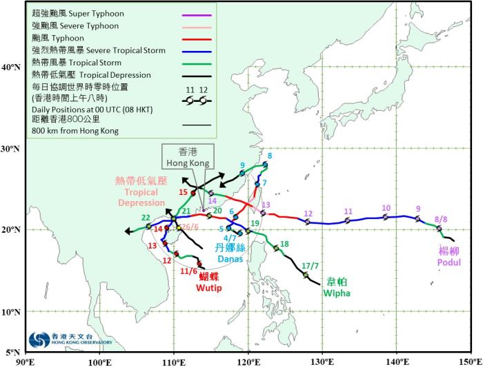根據天文台的初步分析,今年到目前為止,共有14個熱帶氣旋影響西北太平洋及南海,當中有5個熱帶氣旋進入香港500公里範圍內並須要發出熱帶氣旋警告信號,較1月至8月長期平均值的約3.8個為多。這5個熱帶氣旋分別為「蝴蝶」、「丹娜絲」、「韋帕」、「楊柳」及一個在六月未命名的熱帶低氣壓。