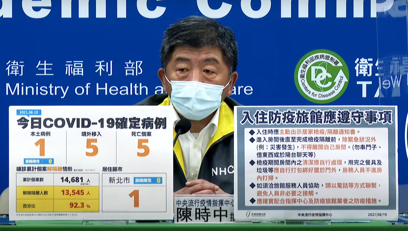台灣中央流行疫情指揮中心今日(8月19日)公布,新增6宗確診病例,分別為1宗本土及5宗境外輸入;確診個案中新增5人死亡。