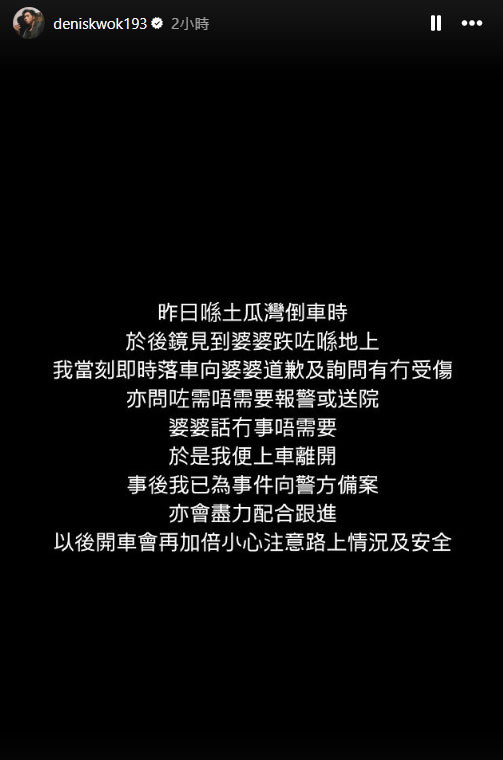 首頁生活資訊娛樂 駕法拉利褪車撞倒過路婦 193稱已道歉及向警方備案 作者:熱血編輯部 (陳五) 08-19-2024 Like Facebook Twitter 更多 Like 分享0 留言0 今日(8月19日)網上流傳片段,見到ERROR成員193(郭嘉駿)的法拉利座駕,於倒車時撞倒途人。影片所見,193駕駛的法拉利跑車於土瓜灣倒車,將一名過路的婦人撞倒。193即時下車,了解婦人傷勢,隨後再登車離去。193之後於社交網站發文,稱當刻時即時落車,向婆婆道歉及詢問有否受傷,亦問了是否需要報警或送院,但婆婆話「冇事唔需要」193續指,事後已向警方備案,日後會駕車加倍小心,留意路面情況及安全。