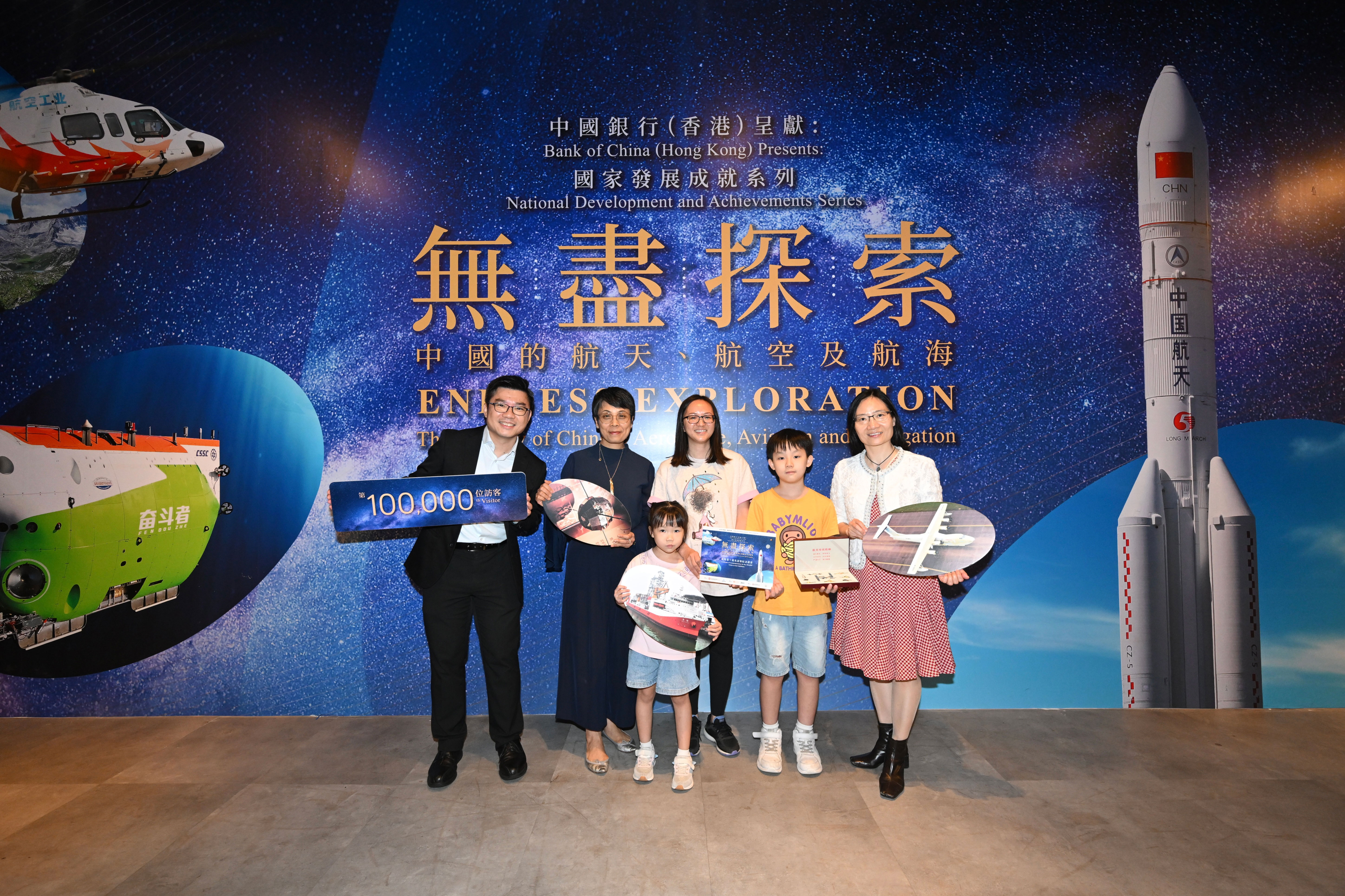 「中國銀行(香港)呈獻:國家發展成就系列——無盡探索:中國的航天、航空及航海」展覽現正在香港科學館舉行,,展期至9月7日,今日(8月19日)迎來第十萬名參觀者。為紀念這個特別時刻,署理康文署署長譚美兒及中國銀行(香港)企業社會責任辦公室副總經理葉麗麗,向第十萬名參觀者送上紀念證書和由國家航天局新聞宣傳中心提供的中國夢.航天夢——航天徽章套盒。