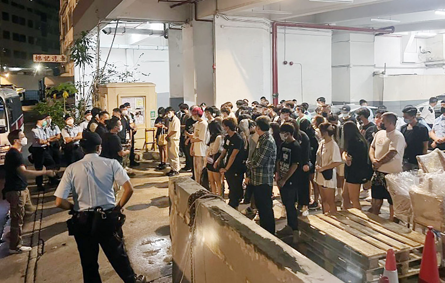 在場的36男14女酒客,年齡介乎介15至30歲,則涉嫌「在沒有領有酒牌的場所飲酒」被捕,他們亦違反《預防及控制疾病(禁止羣組聚集)規例》(第599G章),人員遂向他們發出定額罰款通知書。
