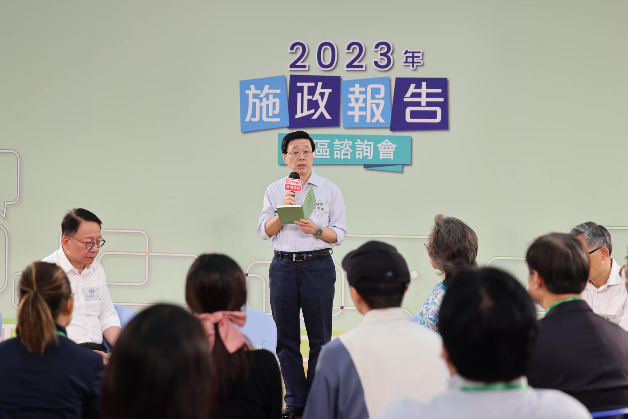行政長官李家超率領司局級官員今早(8月20日)出席2023年《施政報告》地區諮詢會。活動在愛秩序灣官立小學舉行,約120位來自不同背景的市民出席。