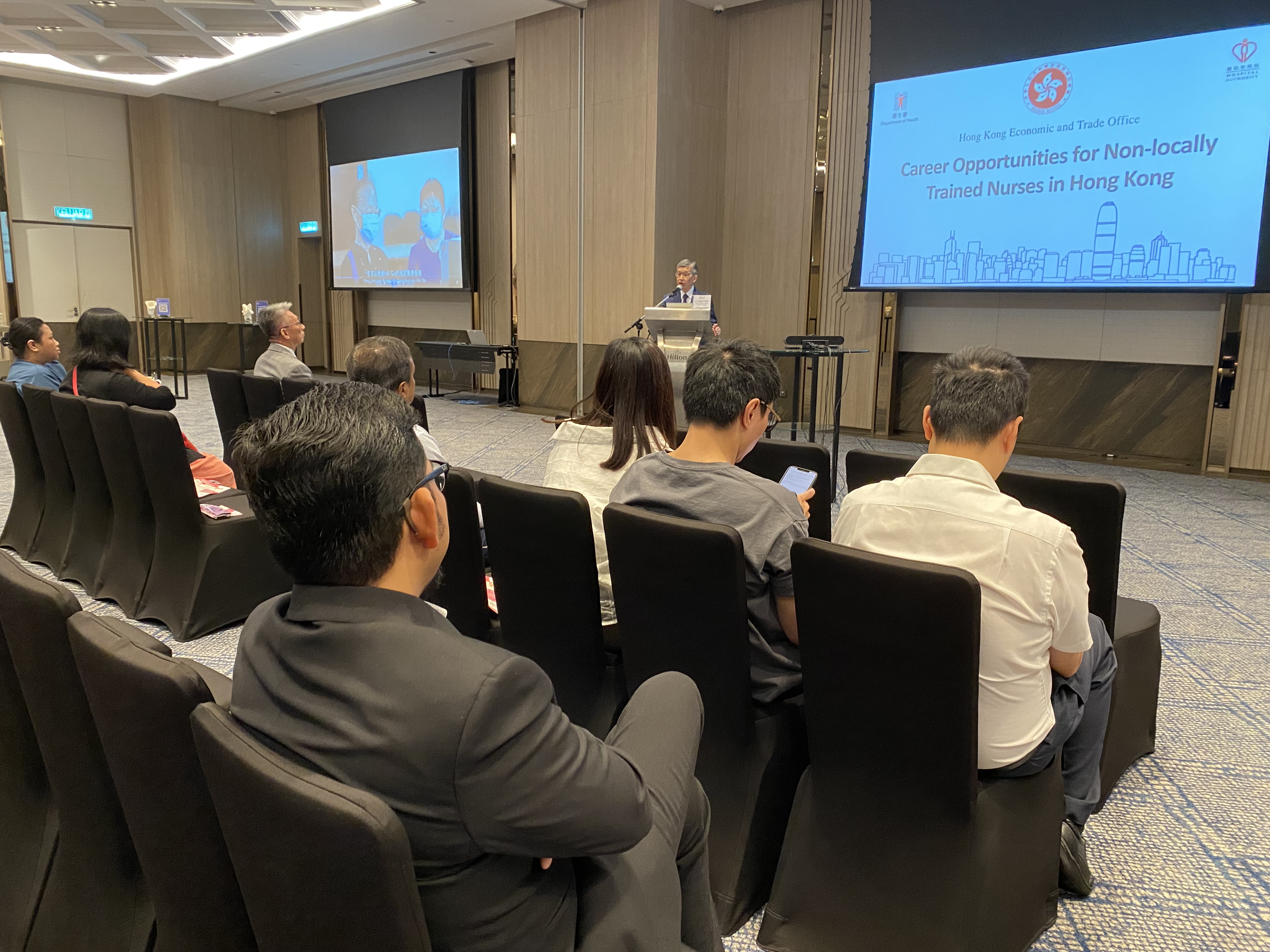 在香港駐雅加達經濟貿易辦事處的支持下,醫管局代表團在吉隆坡舉辦招聘簡介會與當地護士見面交流,衞生署代表亦透過線上形式參與。代表團向當地護士介紹在最新政策下,合資格的非本地培訓護士可透過不同途徑,免考執業試加入本港公營醫療機構工作。