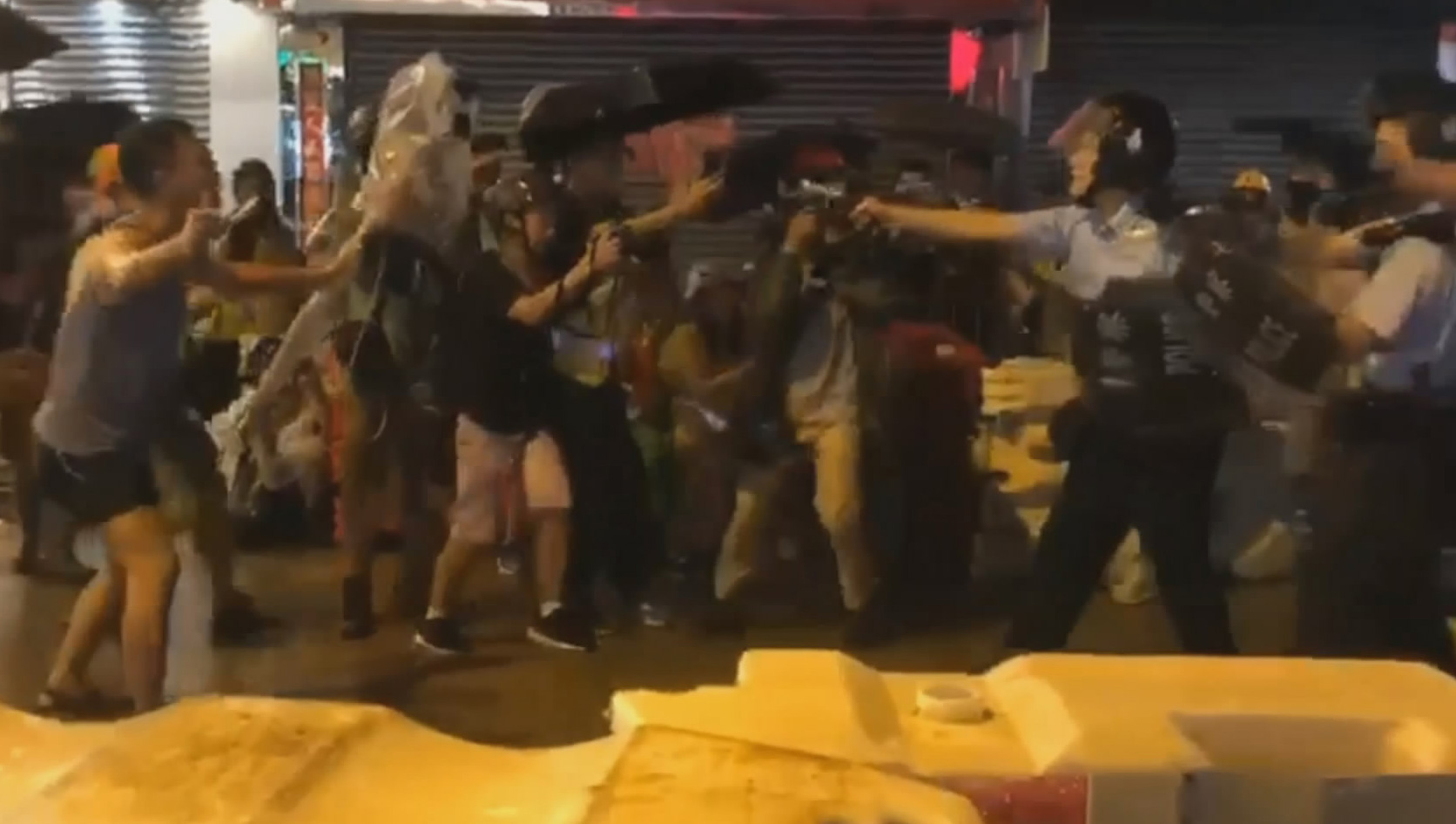 今晚(8月25日)8時許,有示威者向警員掟磚和雜物,之後有3名警員拔槍指嚇現場人群,連記者都成為被指嚇的目標,期間有舉槍警員腳踢一名跪下的市民。