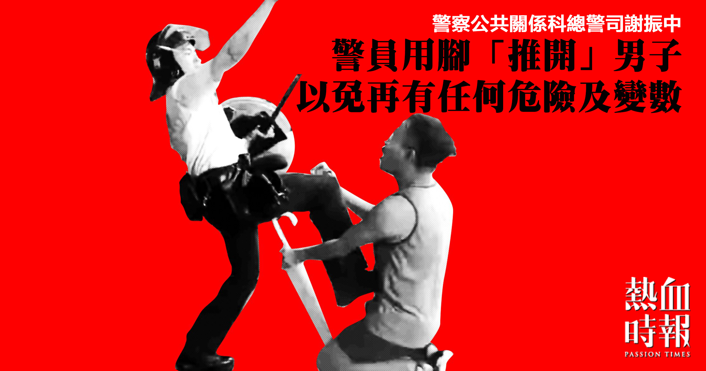 謝振中指,同事當時一手拿著被擊碎的盾,另一隻手擎槍,而當時他的心口及膝頭,都被「暴徒」的鐵通篤傷,當時同事的判斷,是認為不應該有任何人於該位置及範圍,以免再有任何危險及變數,所以該同事於幾秒之間,選擇用腳「推開」該名男子。