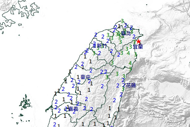 震度方面,宜蘭的冬山及南澳,以及台北信義區均錄得4級。