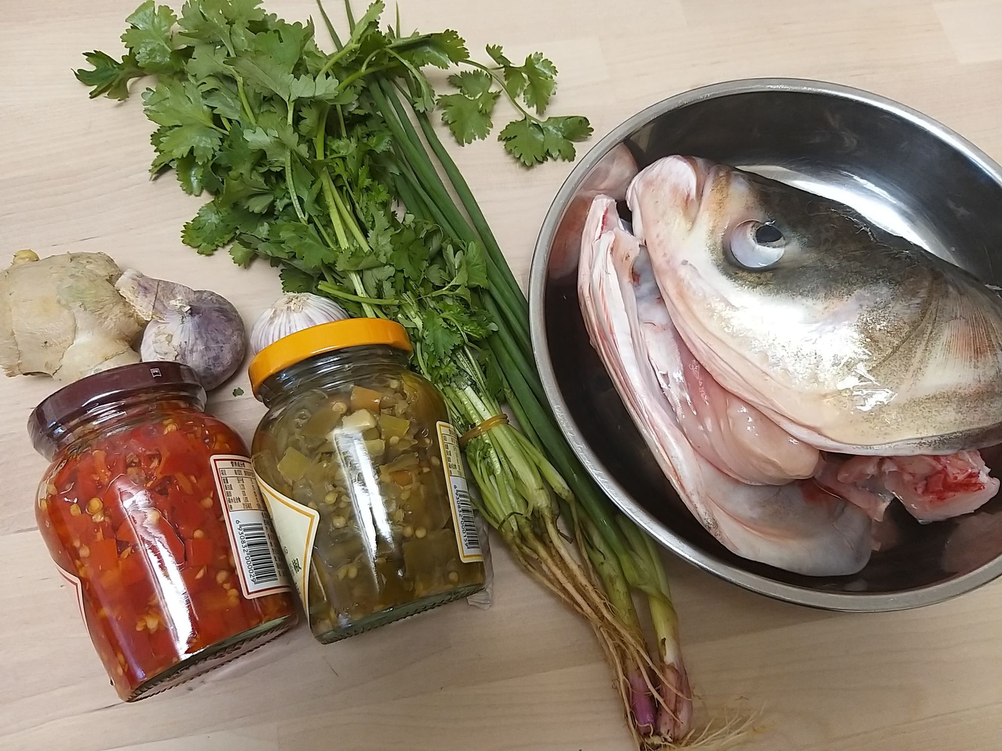 材料:大魚頭、紅剁椒、青剁椒、豆豉、蒜、芫茜、薑片、蔥