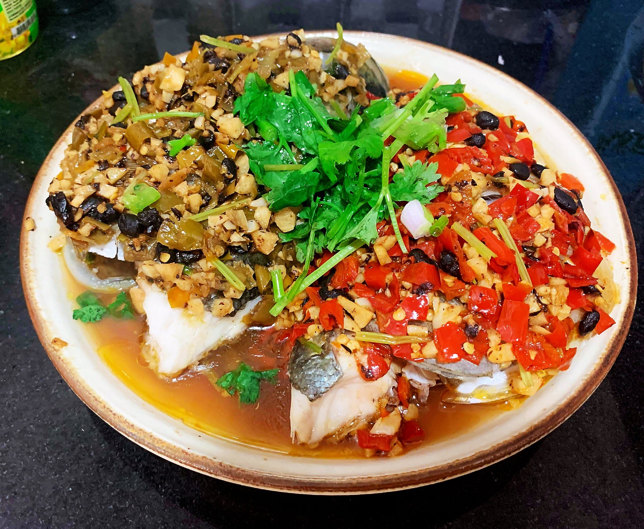 .將炒香和混合了豆豉蒜蓉的紅剁椒和青剁椒,鋪在魚頭上。