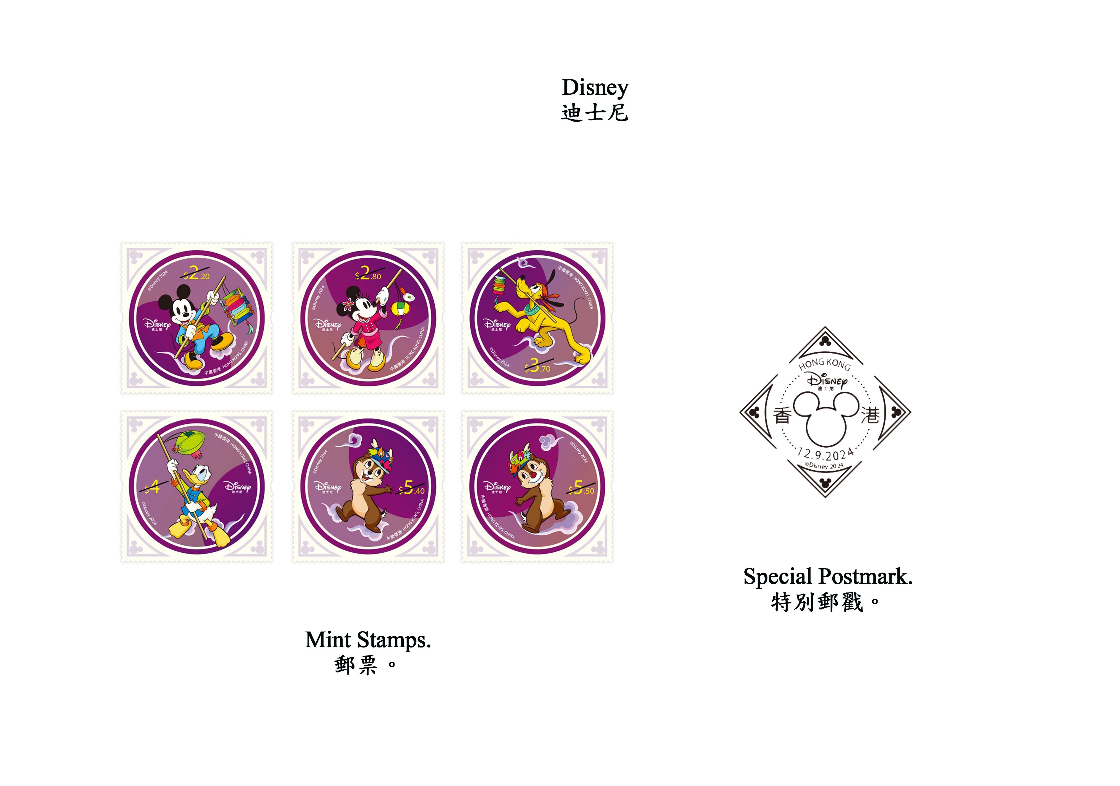 迪士尼動畫人物,尤其是米奇與好友,陪伴一代又一代人成長,而且總是在日常生活中給人們帶來快樂和感動。香港郵政與迪士尼合作,以「迪士尼」為題發行一套六枚郵票、三款郵票小型張及相關集郵品,將大眾熟悉且喜愛的經典動畫人物帶到郵票上。郵票設計更融入本地傳統元素,突顯香港作為中外文化藝術交流中心的獨特魅力。