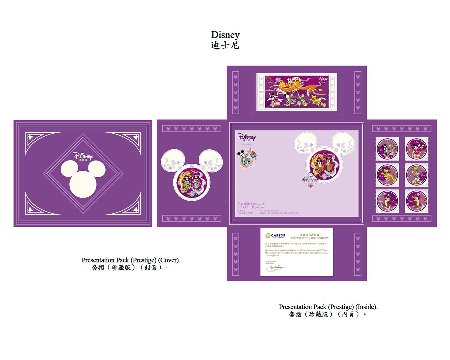 一套六枚不同面額的郵票展示六個穿戴傳統服飾的迪士尼經典人物。十元郵票小型張呈現米奇與好友一起舞動飛龍,二十元及五十元郵票小型張均特別採用米奇老鼠頭像形狀剪裁及立體壓印,而五十元郵票小型張更加上22K金箔燙壓,極具收藏價值。另外,香港郵政亦特別推出嵌有一套六枚郵票的自動黏貼小全張,讓兒童及青少年體驗更簡單和便利的投寄過程,增添樂趣。