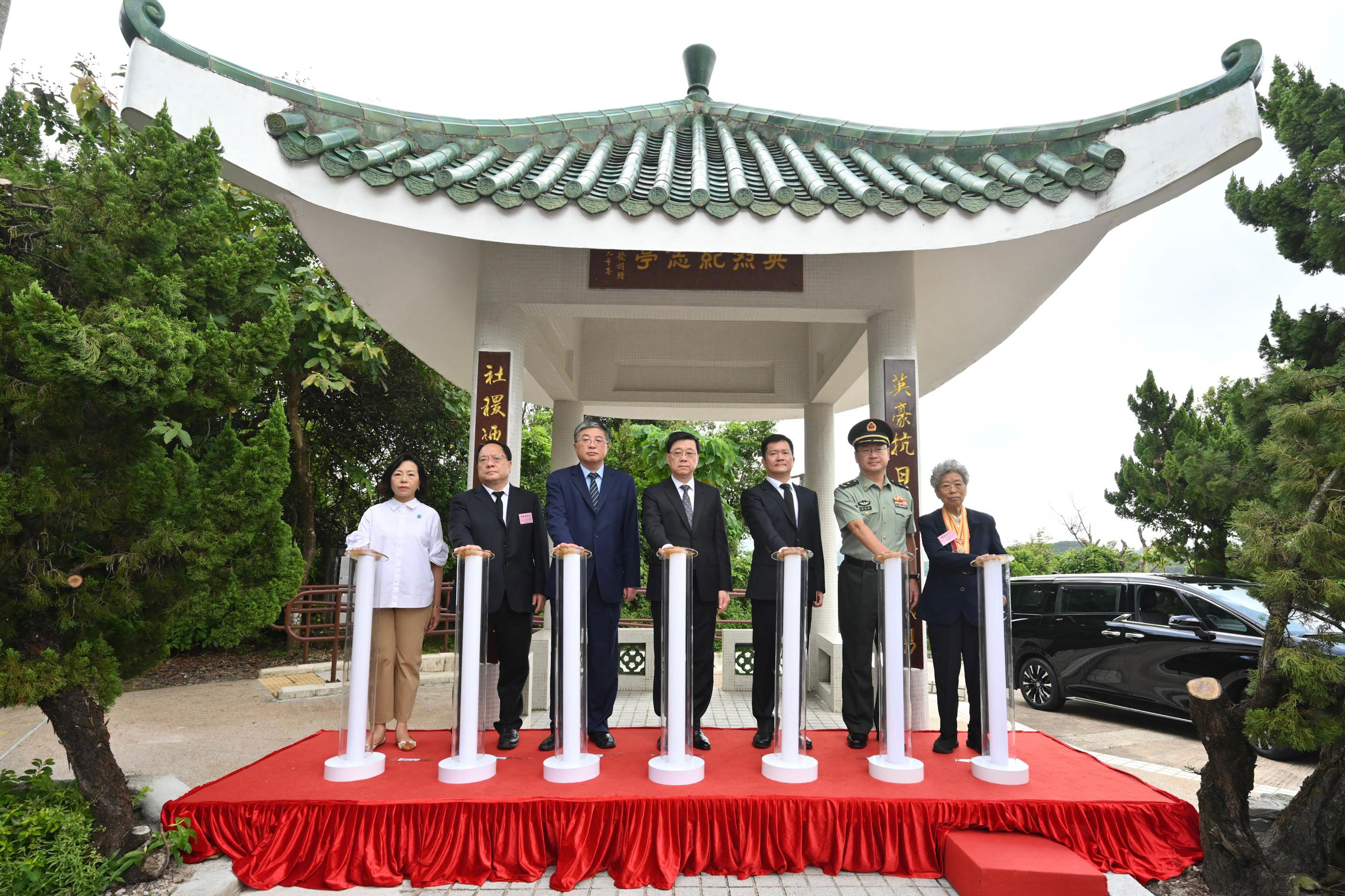 今日(8月30日)早上,特首李家超到西貢斬竹灣,出席抗日英烈紀念碑園典禮,為英烈紀念亭對聯「英豪抗日千秋歌義勇 社稷迎曦八秩頌昌平」主持揭幕儀式。
