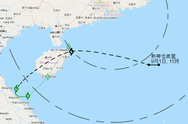 在上午11時,位於南海東北部的熱帶低氣壓集結在香港之東南約450公里,即在北緯19.0度,東經116.7度附近,預料向西移動,時速約25公里,橫過南海北部,移向海南島至雷州半島一帶。