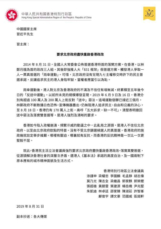24名泛民立法會議員,昨日(8月31日)聯署去信中國國家主席習近平,要求重啟香港政改。