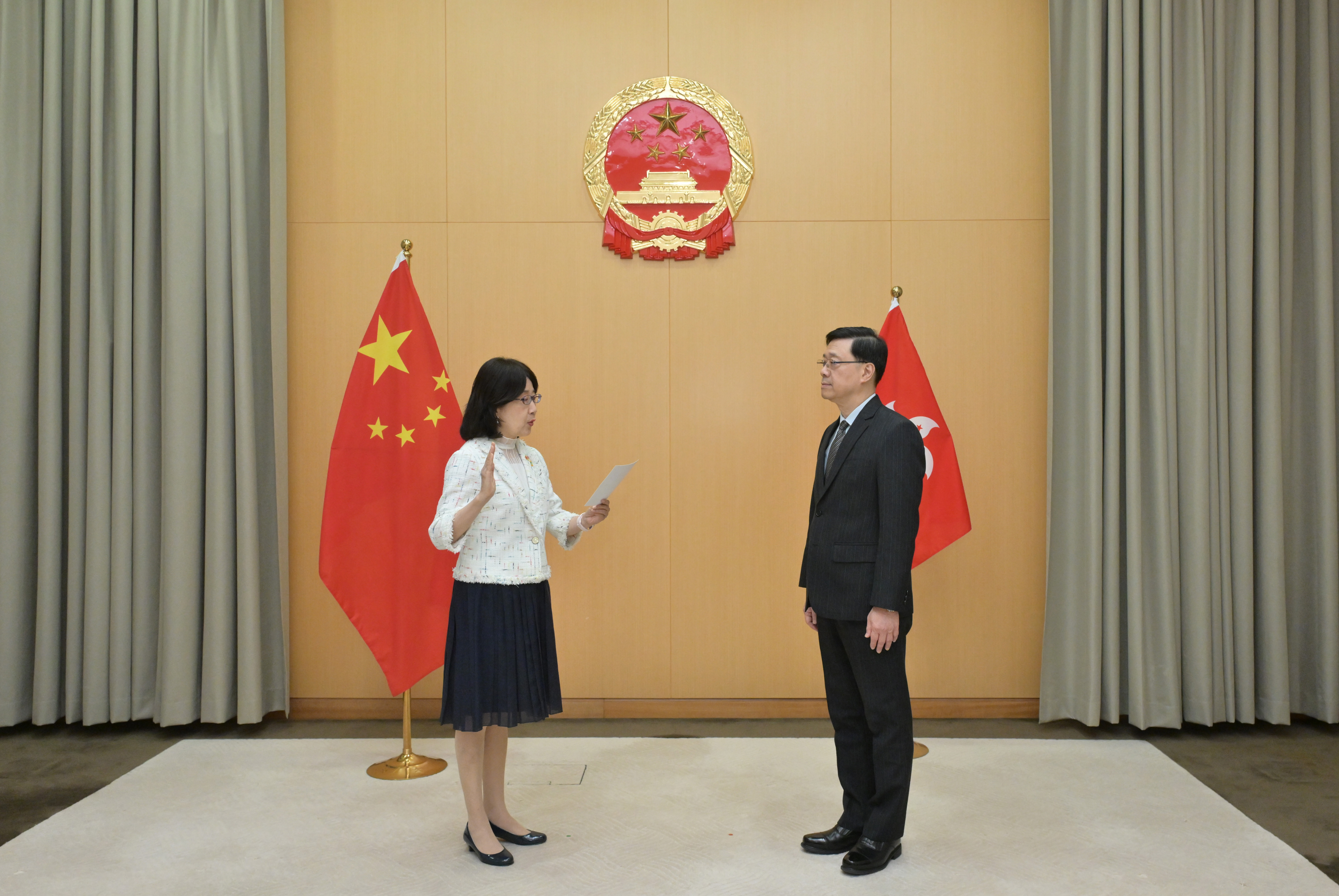 鍾麗玲今日(9月1日)在行政長官李家超監誓下作出誓言,宣誓擁護《中華人民共和國香港特別行政區基本法》,效忠中華人民共和國香港特別行政區,盡忠職守,遵守法律,廉潔奉公,為香港特別行政區服務。