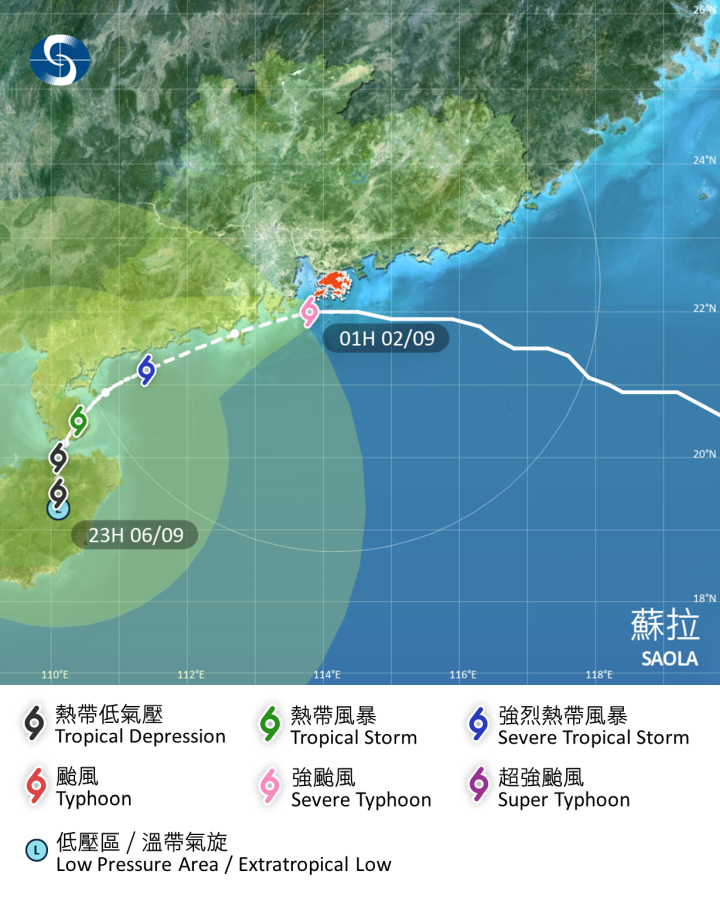 在上午2時,強颱風「蘇拉」集結在香港天文台之西南約70公里,即在北緯21.9度,東經113.6度附近,預料向西或西南偏西移動,時速約14公里,橫過珠江口一帶,移向廣東西部沿岸海域。